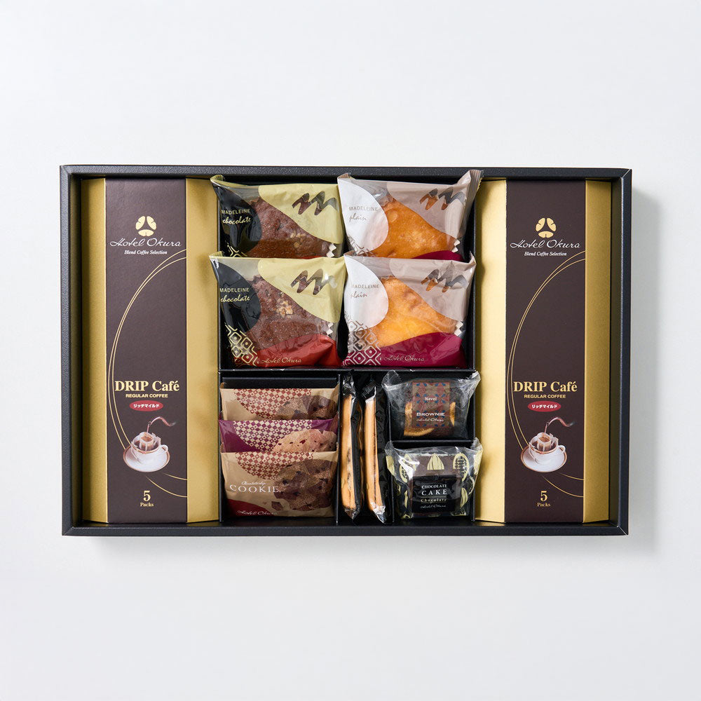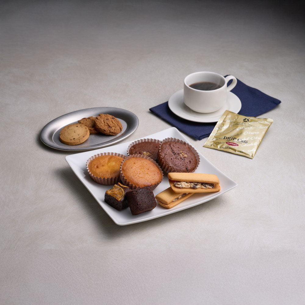 ■ホテルオークラの焼菓子とドリップ珈琲の詰合せ。しっとりした焼きあがりのマドレーヌやレーズンサンドなどさまざまな焼菓子を取り揃えているのにも、選ぶ、味わう楽しさを届けたいというおもてなしの心を感じて頂けるセットとなっています。焼菓子に良くあう上品な味わいのドリップ珈琲と一緒にご堪能ください。