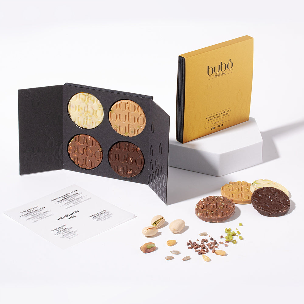 ■スペイン語で本を意味する「LIBRO(リブロ)」。「マンディアン 4」は、まるで物語を巡るように、様々なチョコレートの味わいを楽しめる一品です。4種類のチョコレート(ホワイト、ミルク、ダーク、キャラメル)に、粗く砕いたナッツ(ピスタチオ、ヘーゼルナッツ、パインナッツ、ひまわりの種、カカオニブ)を混ぜ込み、ザクザクとしたナッツの歯ごたえも美味しさの秘密。ブボ・バルセロナとともに、美味しさの旅へ出かけませんか? ※ナッツをふんだんに使った商品のため、チョコレートの形が均一でない場合がございます。