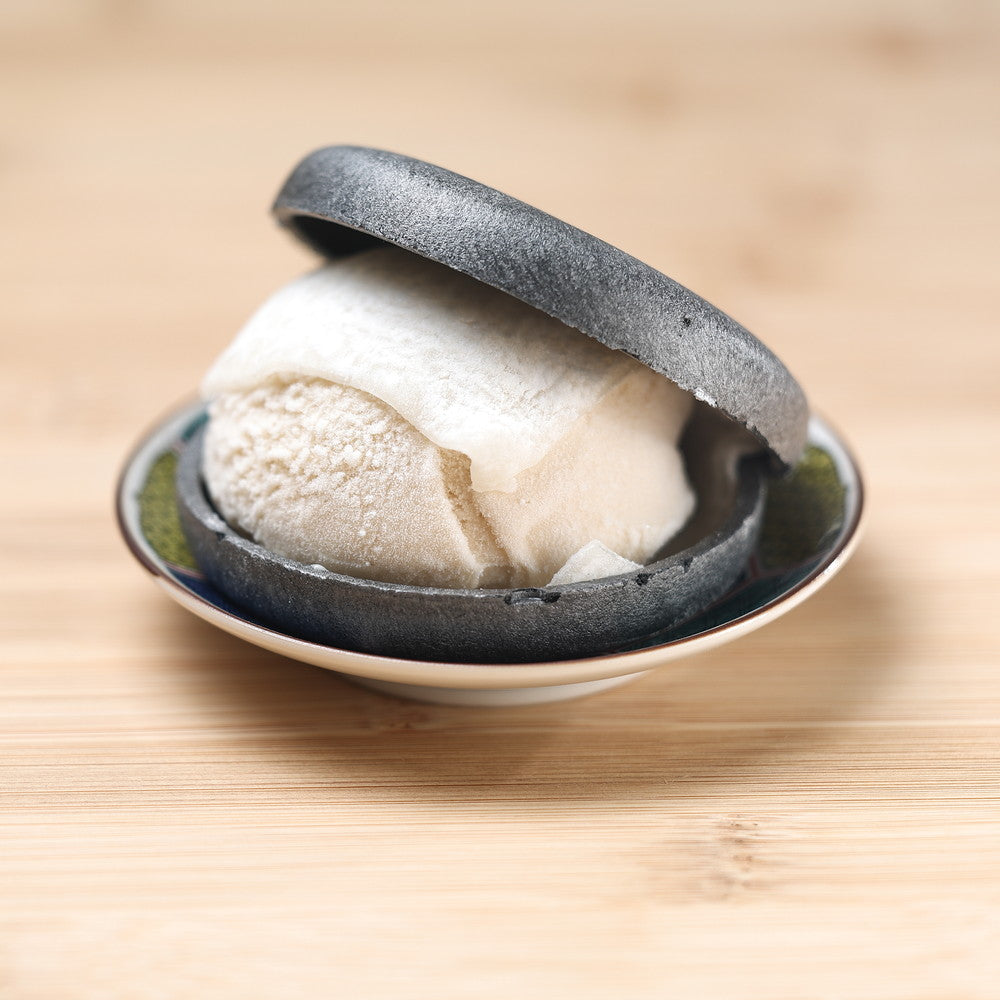 もっちり大福で包んだ特製ジェラートを、食べる直前に香ばしい黒最中でサンド。