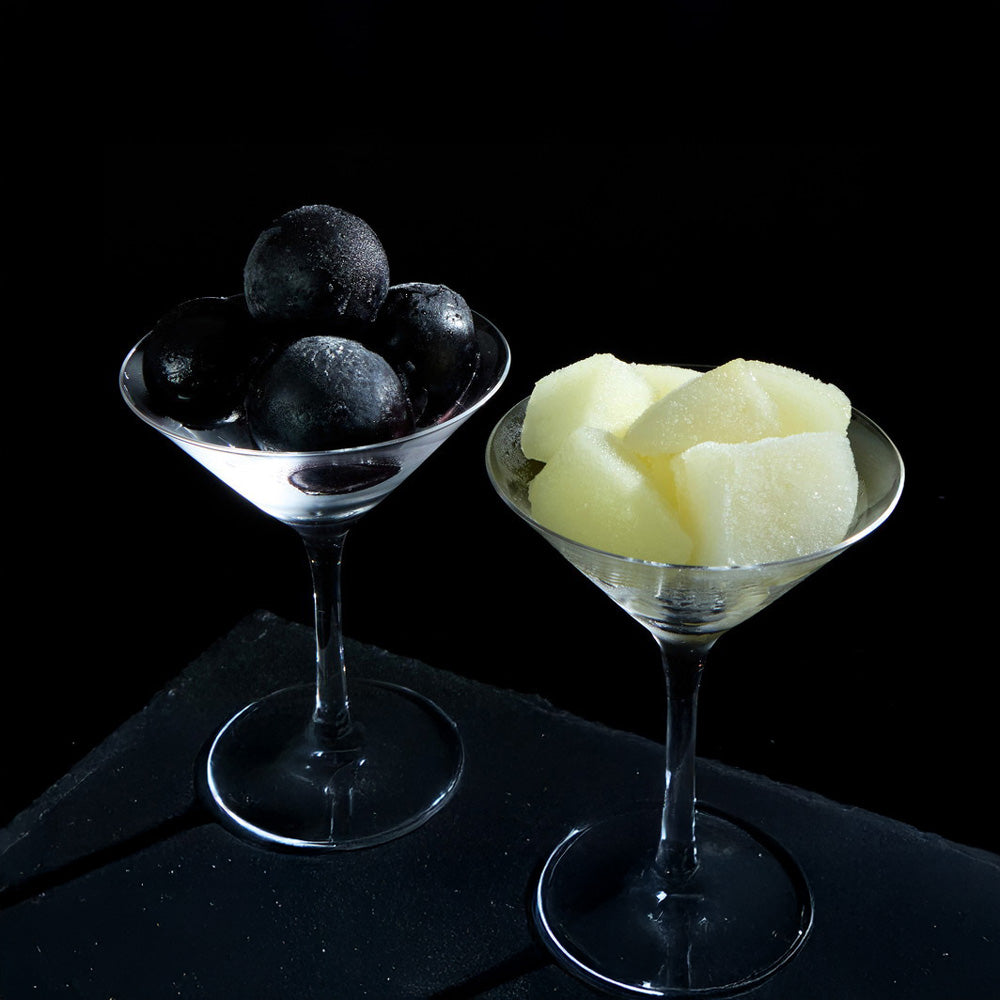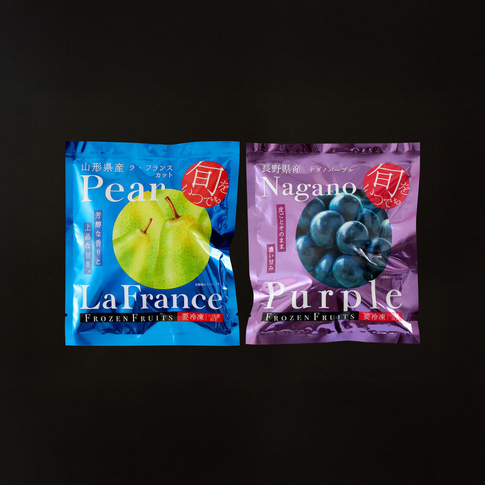 ■山形で育った歯触りのいい甘くてジューシーな洋ナシと、長野で育った深い紫色の美しい果皮のナガノパープルの2種を、一番おいしい旬のタイミングで-30度の液体アルコールに漬けて凍眠冷凍しました。半解凍でシャーベットでお召し上がりいただくほか、ジュースやお酒の氷の代わりとして、スムージーやデザートのトッピングなど、フルーツ本来の香りや甘さをお楽しみください。