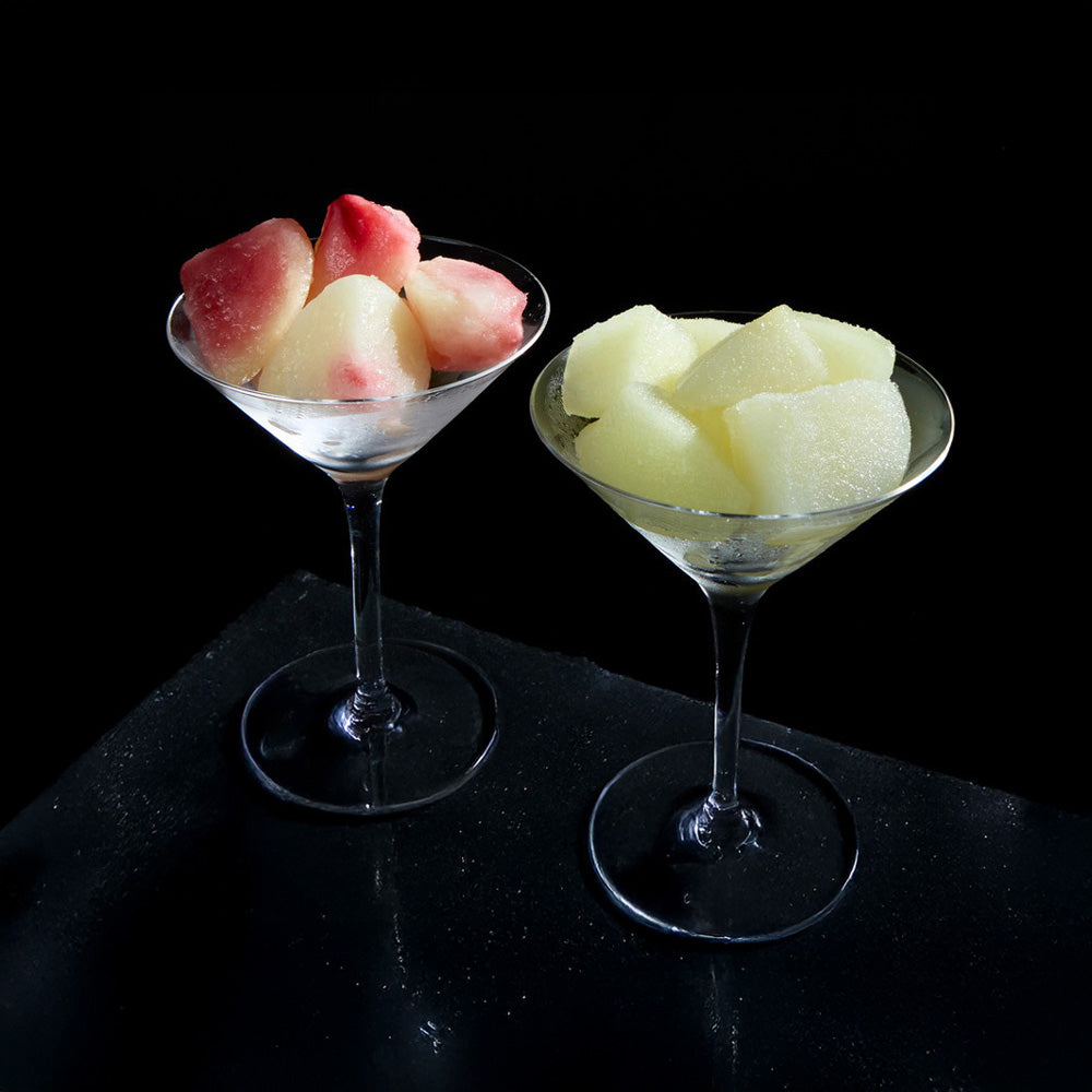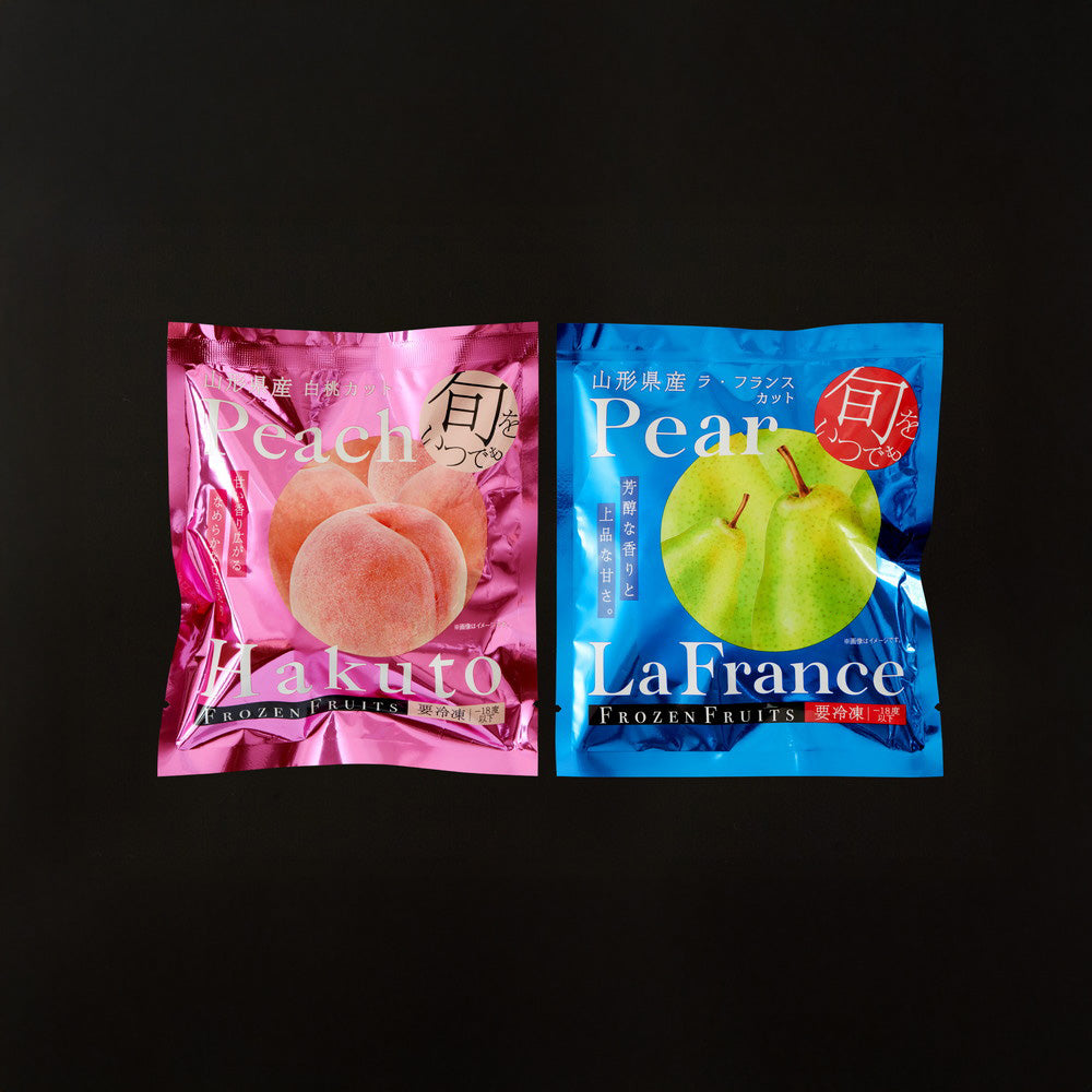 ■山形で育った完熟の白桃と、育った歯触りのいい甘くてジューシーな洋ナシの2種を、一番おいしい旬のタイミングで-30度の液体アルコールに漬けて凍眠冷凍しました。半解凍でシャーベットでお召し上がりいただくほか、ジュースやお酒の氷の代わりとして、スムージーやデザートのトッピングなど、フルーツ本来の香りや甘さをお楽しみください。