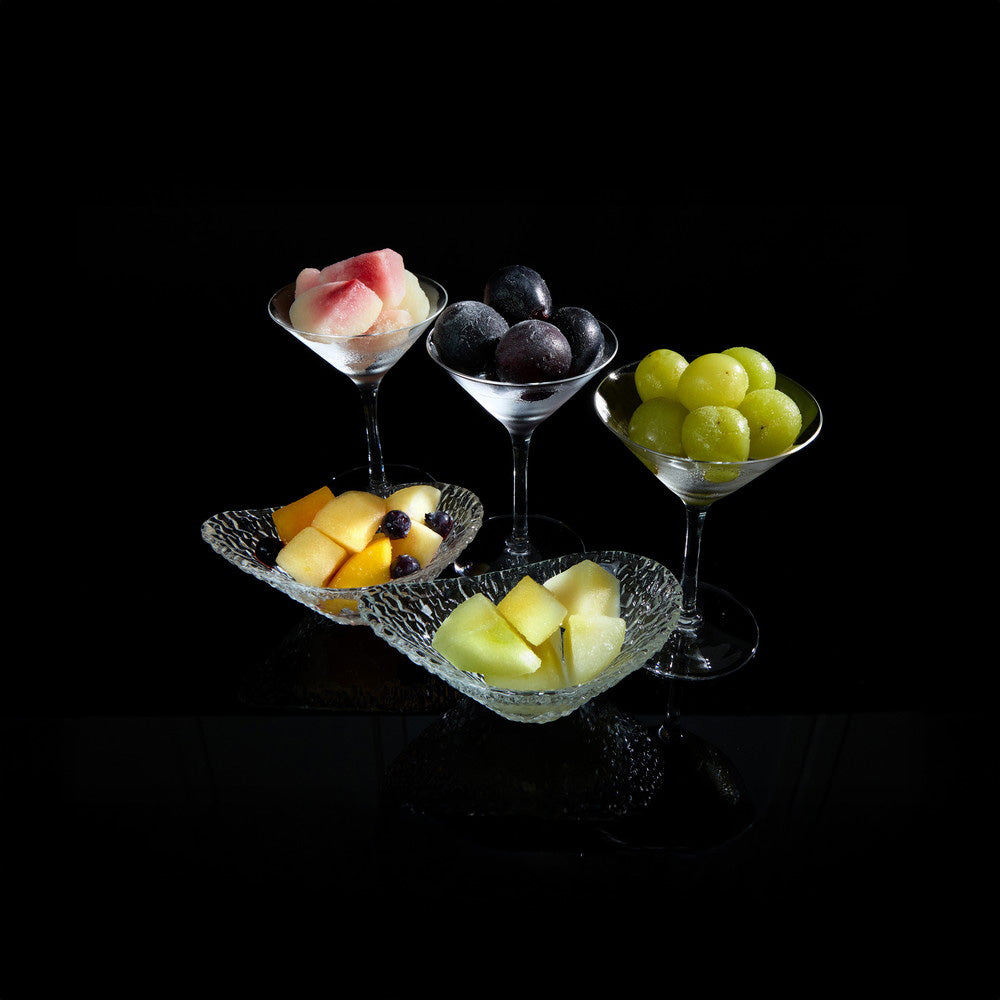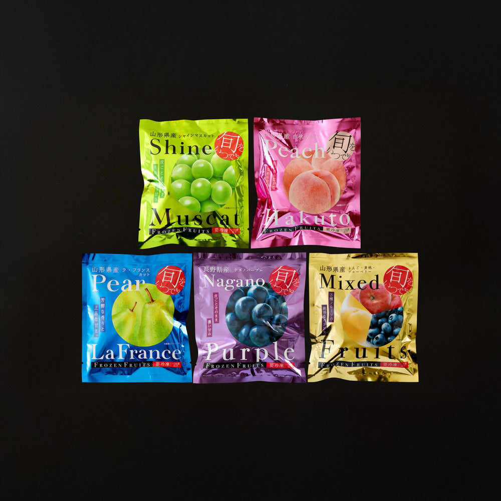■長野で育った深い紫色の美しい果皮のナガノパープルと山形で育った皮ごと食べられる大粒のシャインマスカット、完熟の白桃、歯触りのいい甘くてジューシーな洋ナシ、それとりんごと黄桃、ブルーベリーをミックスしたパックの5種を一番おいしい旬のタイミングで-30度の液体アルコールに漬けて凍眠冷凍しました。半解凍でシャーベットでお召し上がりいただくほか、ジュースやお酒の氷の代わりとして、スムージーやデザートのトッピングなど、フルーツ本来の香りや甘さをお楽しみください。