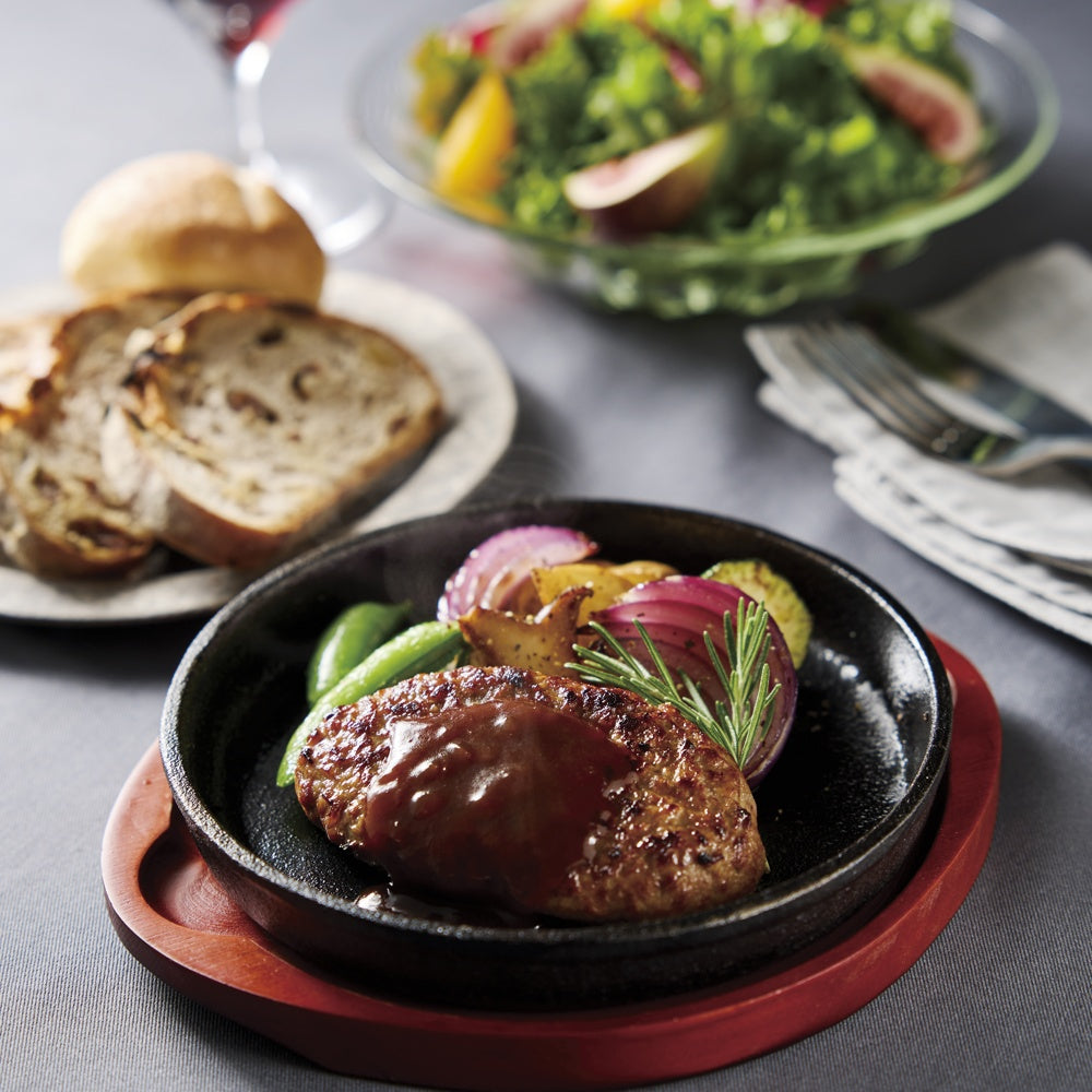 ■飛騨牛を100%使用し、飴色になるまでじっくりと炒められた淡路島産玉葱のソテーオニオンと練り合わてオーブンで焼き上げました。お肉の旨味がぎゅっと詰まった贅沢なハンバーグです。付属のデミグラスソースがハンバーグの美味しさを引き立てます。