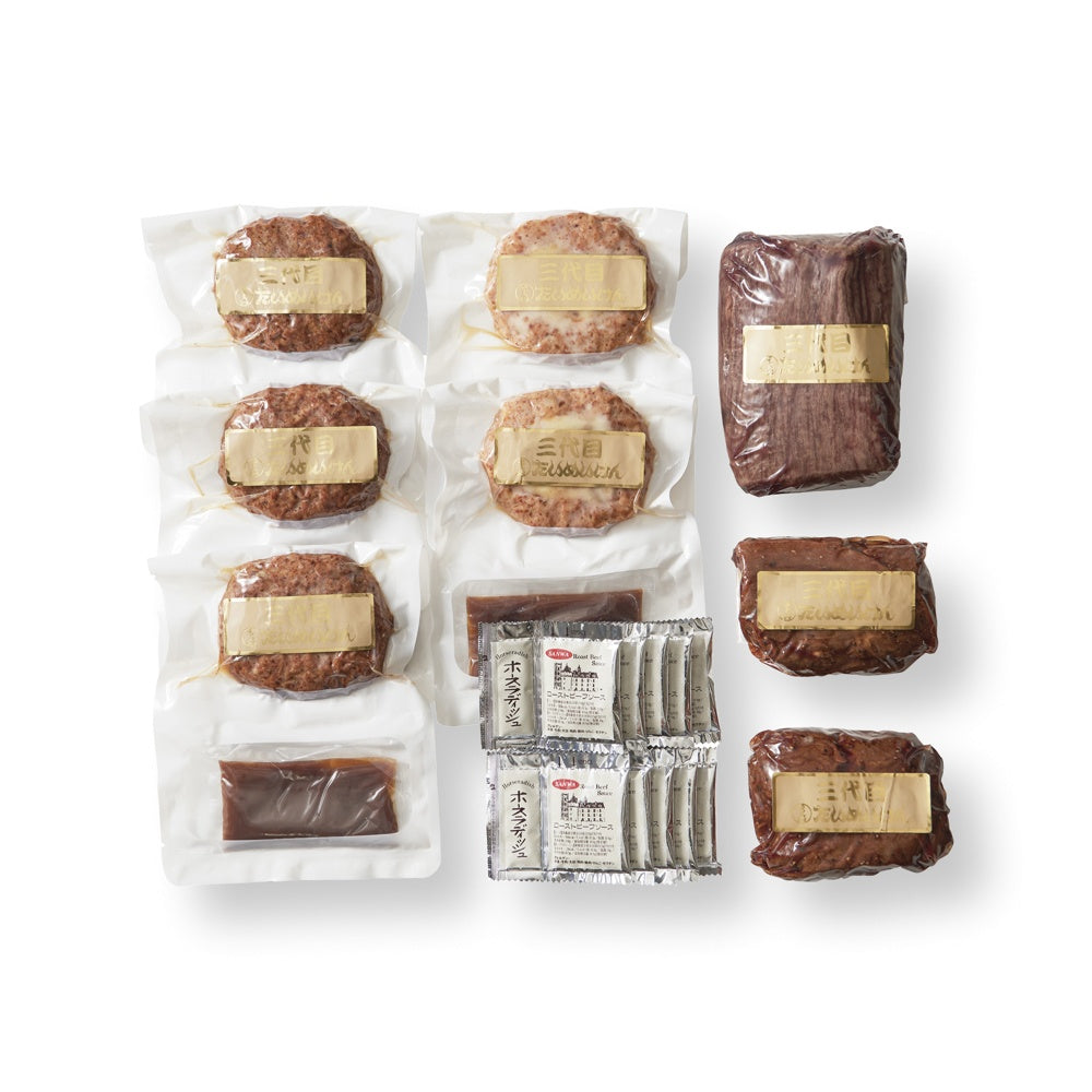 ■昭和6年(1931年)創業、今でも行列ができる洋食屋「たいめいけん」。ローストビーフに最も適しているといわれる国産黒毛和牛の内ももは赤身が中心ですが、ちょうど良い割合でさしが入っています。やわらかな肉質の贅沢な一品です。また希少部位であるトモサンカクのローストビーフは牛の中でも赤身の中に上質な脂の刺しが入るバランスが良い部位です。和牛ハンバーグも肉は黒毛和牛のみを使用。玉ねぎも国産です。チーズハンバーグは国産豚と国産牛肉の合挽ハンバーグ。ドイツ産ゴーダチーズをのせたチーズと肉が程よく絡む逸品です。余計なものは加えず、肉本来の味で勝負。たいめいけん自慢のデミグラスソース付き。湯せんで簡単に本格的な洋食屋の味がお楽しみいただけます。