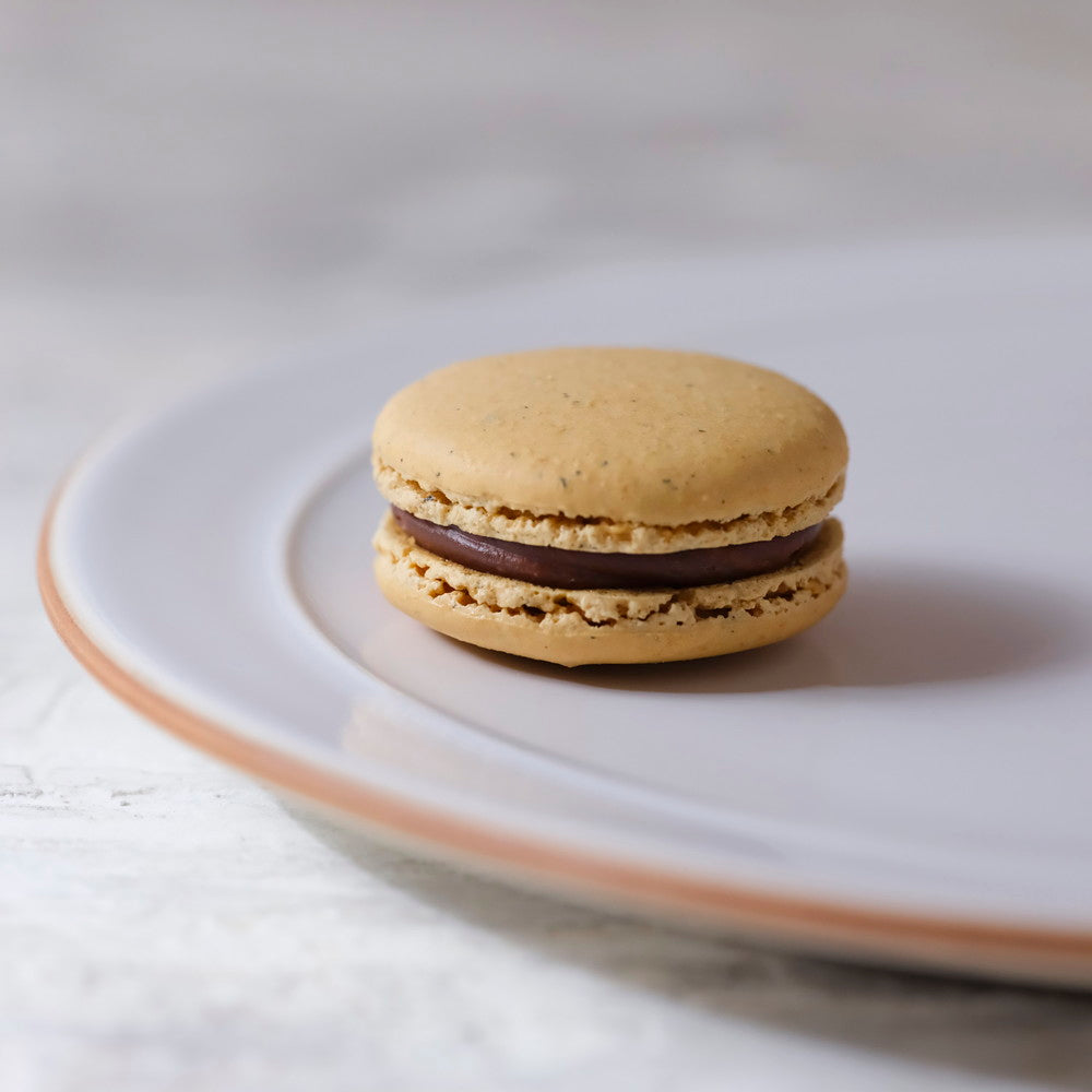 マダガスカル島北部で収穫されたフローラルでフルーツの香りが特長のチョコレート、マディロフォロ65% を使用したガナッシュ。マカロン生地にもカカオ豆を練り込みチョコレートらしさをより一層引き立てました。